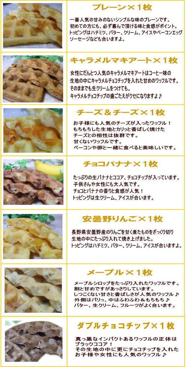 ■米粉ワッフル:プレーン・キャラメルマキアート・チョコバナナ・メープル・安曇野りんご・チーズ&チーズ・ダブルチョコチップ