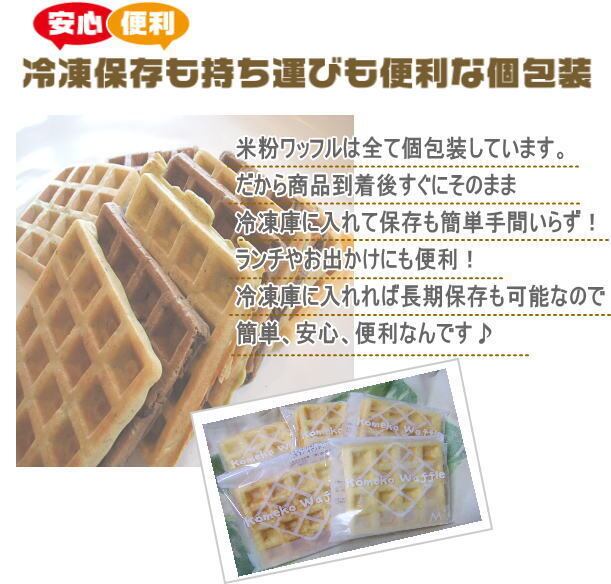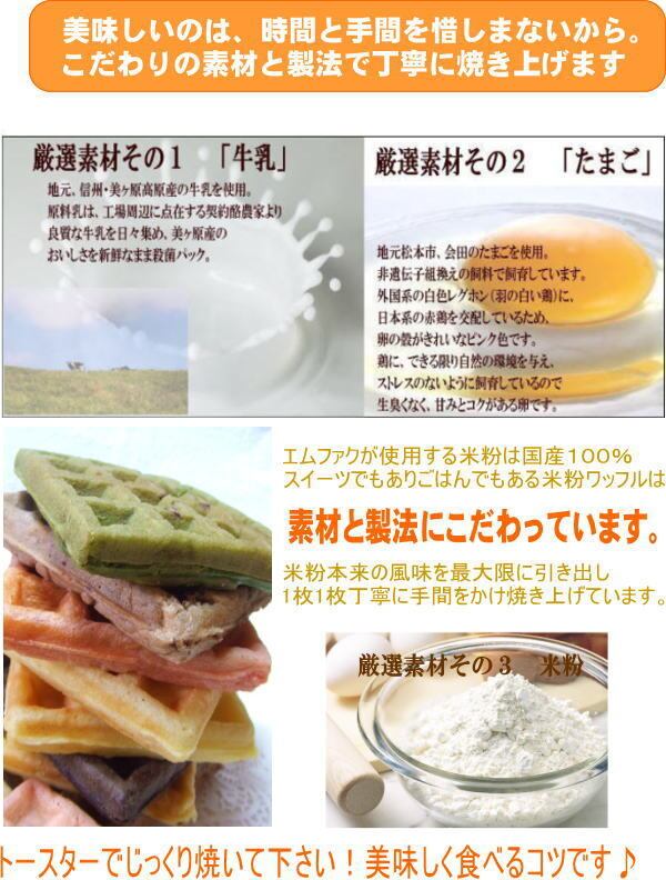 一枚一枚じっくり丹念に焼き上げた米粉100%のワッフルは、エムズファクトリー創業以来の看板商品。毎日食べても飽きないご飯感覚のスイーツをコンセプトに、小麦粉や小麦グルテンを使わない、これまでにない新しい製法の国産米粉100%、グルテンフリーのワッフルです。国産の米粉のほか、卵、牛乳、フルーツ類など多くの素材に、地元長野県産のものを使用しています。地産地消を心がけ身体に優しい商品に仕上げています。