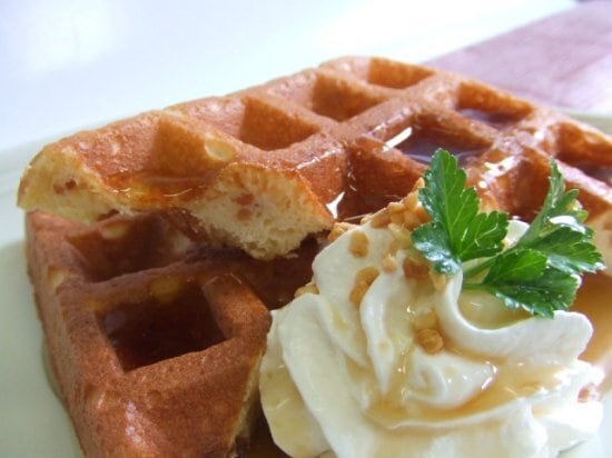 しつこくない甘さと香ばしさが人気のワッフル♪美味しいワッフルはそのままでもさらに追いメープル、生クリームをつけても。